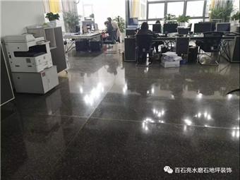平整、光滑、質(zhì)地堅(jiān)硬、經(jīng)久耐用、使用壽命長(zhǎng)、色澤豐富、樸素大方、裝飾效果好,這些都是水磨石的特點(diǎn)。在這里可以說把水磨石的特性發(fā)揮到了最大化。辦公室人員絡(luò)繹不絕、辦公椅的來回滑動(dòng),都會(huì)和地面產(chǎn)生最直接的接觸,我們的水磨石地面不但沒有因?yàn)轭l繁的摩擦而損壞,反而更加的色澤光亮。