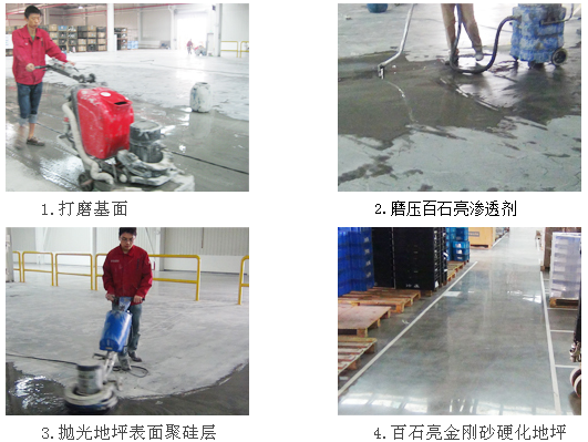 清潔地面→去除起砂破損層→打磨或修復→磨壓百石亮滲透劑→封堵毛細孔結晶→磨壓百石亮硬化劑→金剛砂聚硅改性→拋光百石亮晶面劑→金剛砂硬化地坪
