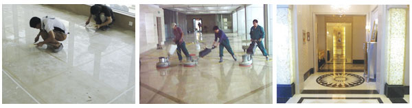 4. 修補及拋光:對鋪設好的鈦晶水磨石層壓實、找平、打磨,再用鈦晶脂清漆修補后打磨,直至表面光潔平整,無空鼓,無氣孔;